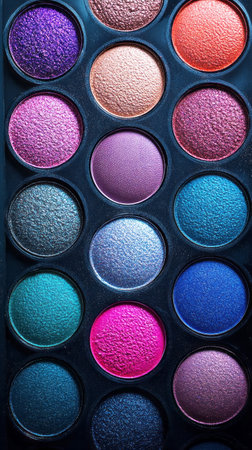 A detailed close-up of a vibrant eyeshadow palette featuring an array of colors and textures, perfect for makeup enthusiasts and artists.