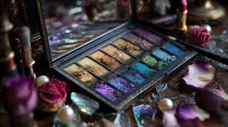 A vibrant eye shadow palette sits open on an old wooden table, next to delicate roses and sparkling crystals in soft light.