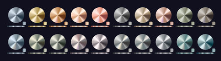 Realistic metallic gradient set with brushed textures in various shades of gold, silver, bronze, steel. Shiny polished surfaces for branding, design, and luxury product visuals. Vector illustration
