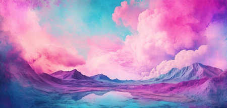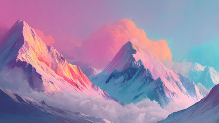 A vibrant abstract mountain landscape showcases colorful peaks at sunset, blending soft pink and blue hues in a serene and imaginative scene. Perfect for artistic projects.