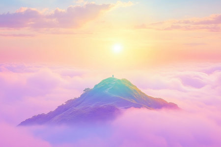 Mountain peak rising above clouds under colorful pastel sky at sunrise. Mist and sunlight create dreamy, tranquil and uplifting scenery.