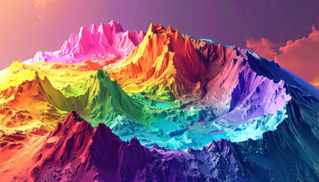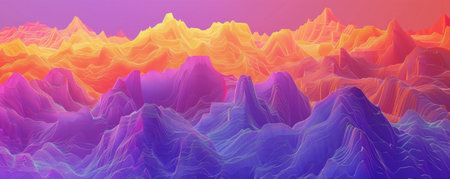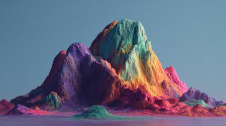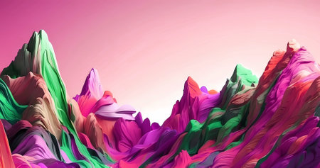 An abstract rendering presents a colorful mountain range. The composition showcases vibrant hues of green, purple, pink and yellow. The style is digitally created, featuring textured surfaces and gradients. This image is suitable for various commercial uses, including artistic designs and conceptual illustrations.