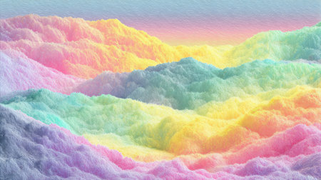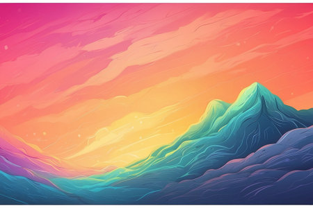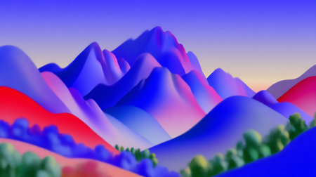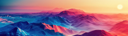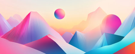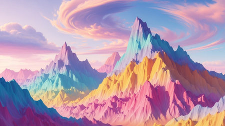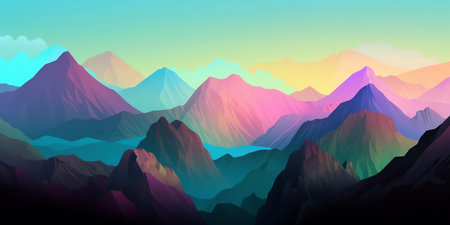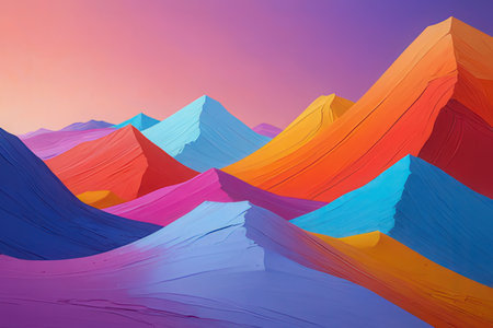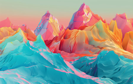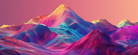 Vibrant abstract mountain range with colorful peaks and gradients against a soft sky.