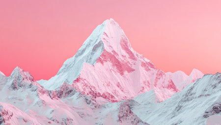 A breathtaking snow-covered mountain summit bathed in the soft, warm hues of sunrise. The tranquil scene evokes peace and the raw beauty of nature's grandeur, with delicate pink and orange gradients painting the sky above the pristine white slopes.