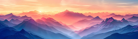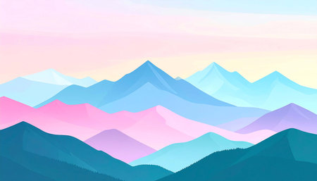 Pastel-hued mountain range at sunrise/sunset, depicted in a stylized, minimalist vector art style, showcasing soft gradients of pink, blue, and teal tones across layered peaks