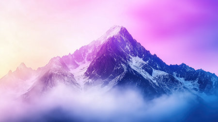 Majestic mountain peak surrounded by clouds, showcasing vibrant purple and pink hues in sky. breathtaking view that evokes sense of wonder and tranquility.
