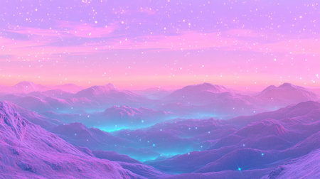 Explore a vibrant dreamscape with twinkling stars illuminating surreal mountains. This serene scene captures the beauty of a neon-colored sky, evoking a sense of tranquility.