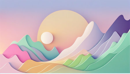 A tranquil digital landscape of mountain ranges in soft pastel tones of blue, pink, and orange