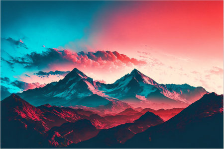 Beautiful mountain landscape with red and blue sky. 3d rendering