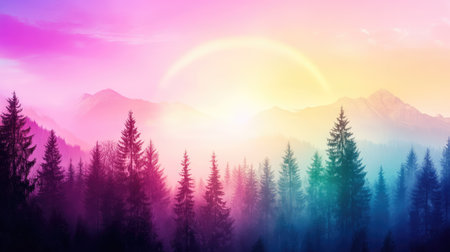 Mountain landscape with forest and rainbow. Colorful summer background.