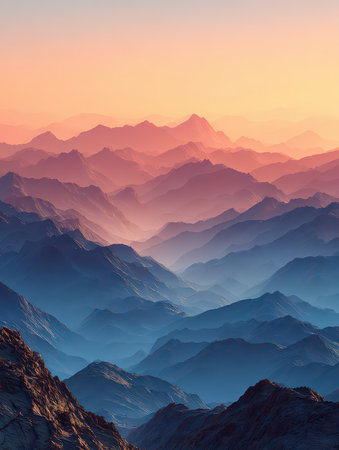 A breathtaking view of mountains layered in soft hues during sunset, showcasing the natural beauty and tranquility of the landscape with a stunning gradient effect.