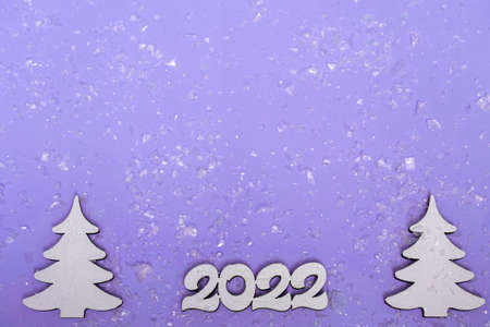 Merry Christmas and Happy New Year. Festive poster with a Christmas tree, sleighs on a purple background with lights. New year 2022 with copy space close up