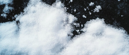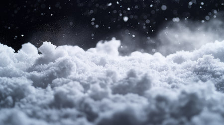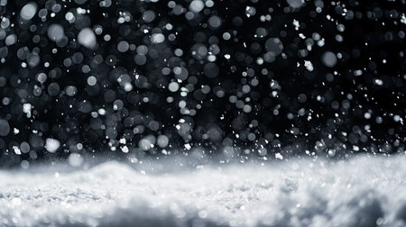 Fresh snow texture with delicate flakes on a black background for design purposes