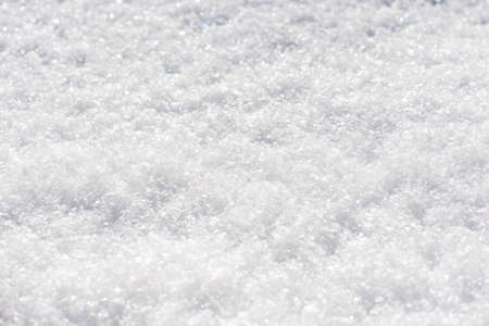 Sparkling white snow crystals covering ground wintertime close up. Texture of smooth surface covered soft snow at sunlight. Beautiful snowflakes shining on winter cold sunshine. Natural pattern.
