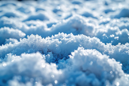 This stunning close-up captures the glistening texture of fresh snow under warm sunlight. The soft focus creates a tranquil winter atmosphere, perfect for seasonal themes.