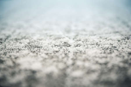 Close up macro photography texture of sparkling fresh white snow with light blue sky reflection tone. selective focus. winter christmas background.