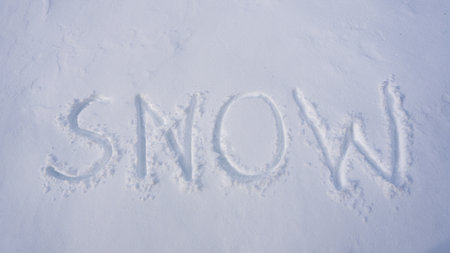 Winter text on snowy background. Snowy print design for winter. Frosty winter text outdoors. Winter text with snowflakes. Icy background with snow banner. Snowy field with snow print.