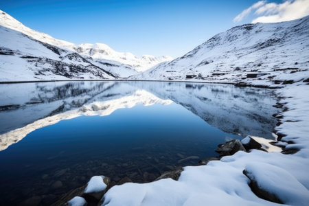 reflective glacier lake surrounded by snow, created with generative ai