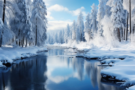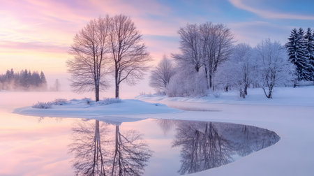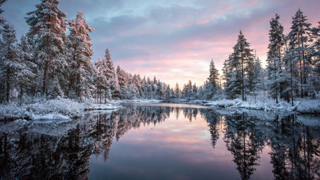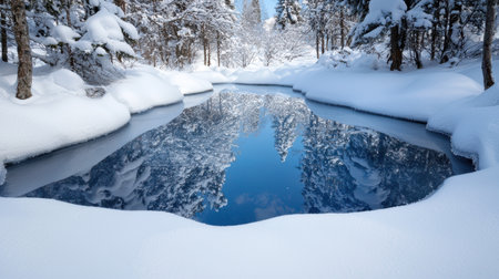 Serene winter wonderland with snow-covered trees reflecting in a frozen pond