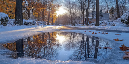 Winter Sunrise in Suburban Neighborhood with Snow-Covered Streets and Reflections