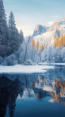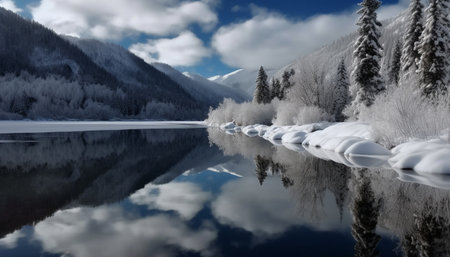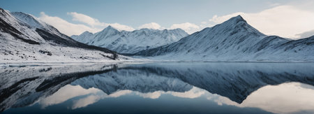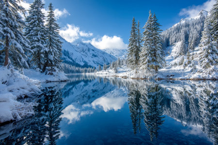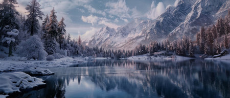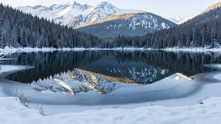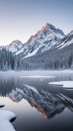Pristine winter landscape showcasing snow covered mountains reflected in the calm waters of a glacial lake, with frost covered trees adding to the serene beauty
