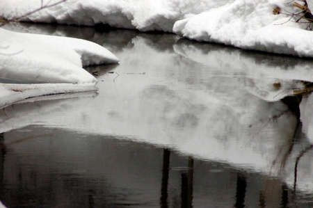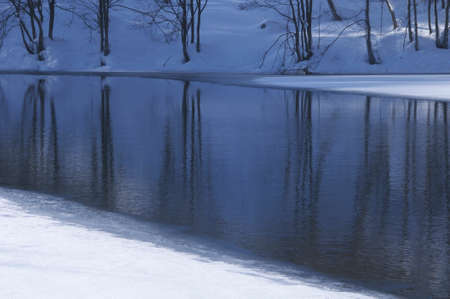 Reflections of snow in winter forest lakes