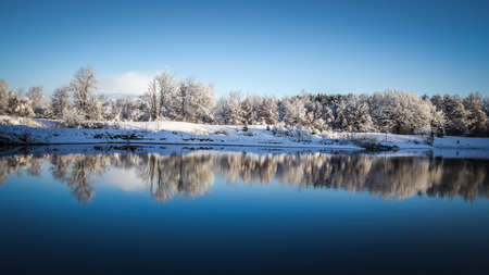 Winter landscape with snow covered trees and forest lake.