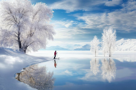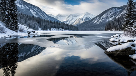 AI Generated. Frozen lake reflecting a serene winter landscape under a cloudy sky in the afternoon light