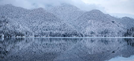 Winter natural landscape with reflections of snow capped mountains and forests