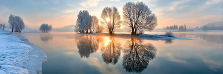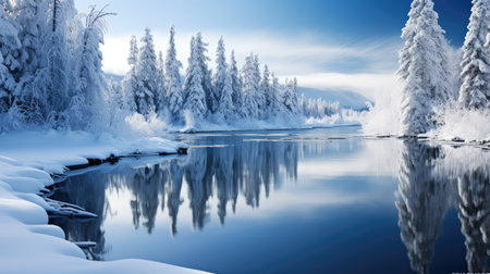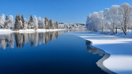 Serene Winter Landscape with Snow-Covered Trees and Calm River