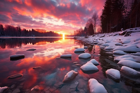 A stunning winter sunset reflected on a frozen lake, showcasing the serene beauty of a snowy landscape.
