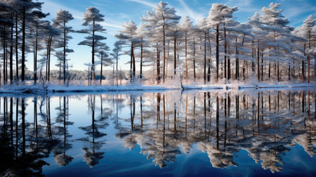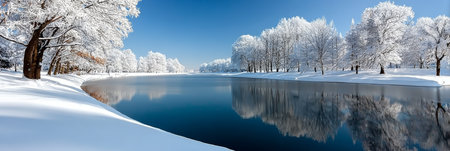 A serene winter landscape with a frozen lake reflecting the snowy trees and the clear sky.