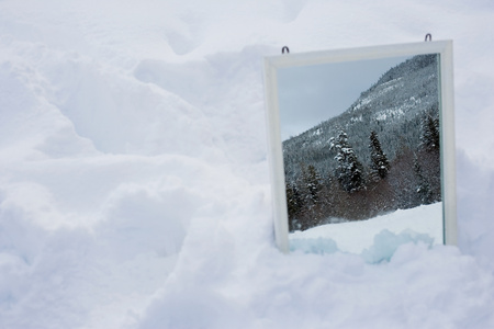 Reflection of a winter scene in a mirror