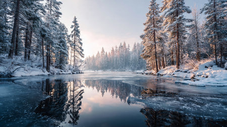 Tranquil scene of a snowy forest with evergreen trees and a partially frozen river reflecting pastel skies at sunrise or sunset.