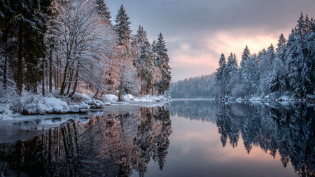 Serene Winter Beauty Pristine Snow-Covered Trees and a Tranquil Lakeside Scene Reflecting Ice