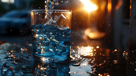 A dynamic shot of water splashing in a clear glass, illuminated with vibrant blue lighting and bokeh effects, creating a refreshing and energetic scene.