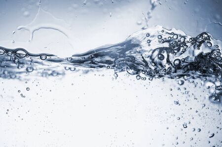 Water splashes with bubbles. Fluid in motion. Selective focus. Close up and horizontal orientation.