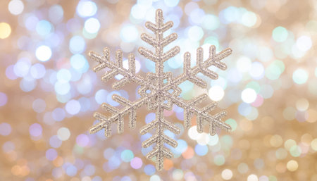 Sparkling gold snowflake decoration floating over soft pastel bokeh background with warm luminous circles. Perfect for Christmas marketing, winter celebrations, and festive designs.