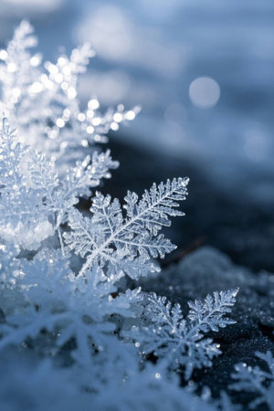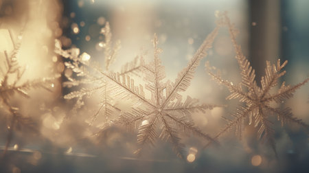 An enchanting closeup image of delicate, intricate snowflakes shimmering beautifully against a rich, dark background, evoking the pure essence of winter and the joyful spirit of the holiday season