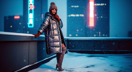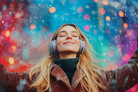 Woman enjoying a snowy winter day with twinkling lights in a city setting