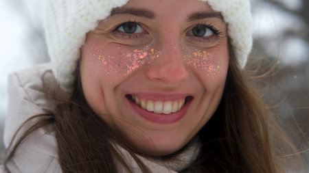 Portrait of woman in warm white knitted hat outdoors in winter. Young woman smiling and enjoying beautiful weather and first snow, laughing and looking at camera. Active winter recreation. Wide, beautiful smile. Close-up