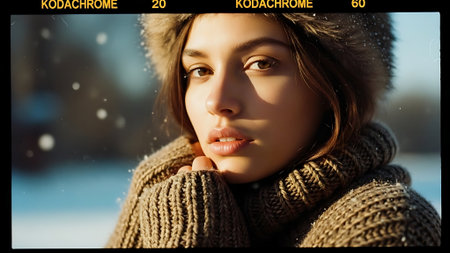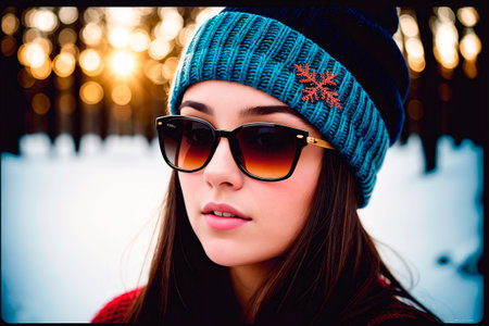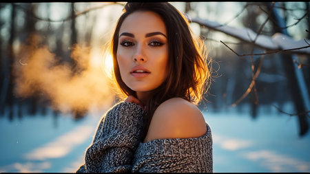 A young woman in a cozy oversized sweater poses in a snowy landscape with evergreen trees in the background, sunlight glistening through falling snowflakes