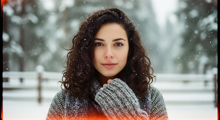 A woman posing in a snowy landscape, wearing a cozy sweater and a fur vest, with snowflakes falling around her, creating a serene winter atmosphere