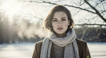 Beauty portrait of beautiful attractive woman, young calm woman at fresh air at winter cold frosty snowy day.