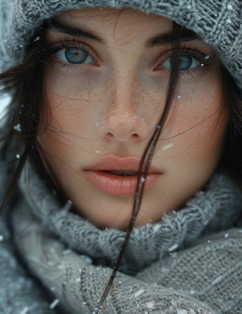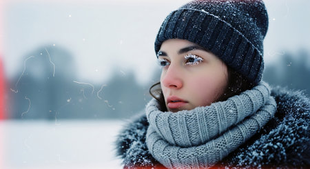 Young woman with blue eyes wearing knitted hat and scarf in snowy landscape during winter