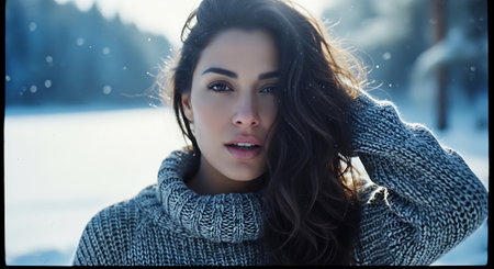 A woman with long dark hair wearing a cozy sweater, standing in a snowy forest with soft sunlight filtering through the trees