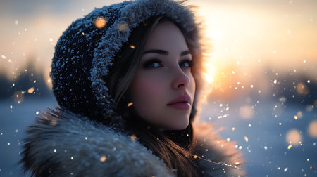 Generative AI Image of Woman in Warm Fur Jacket with Beautiful Smile at Winter Sunset Sunrise Sky