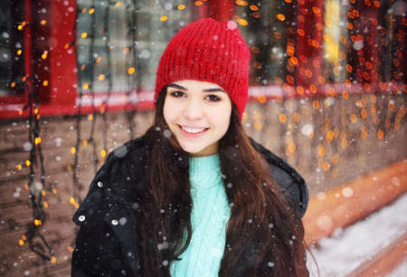 young girl in red knitted hat smiling against the background of snow and Christmas lights