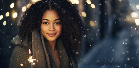 beautiful african american woman with sparklers in winter city