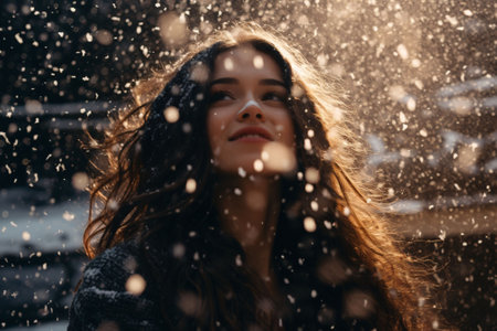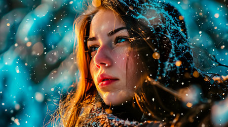 Portrait of a beautiful girl with curly hair on a background of snowfall